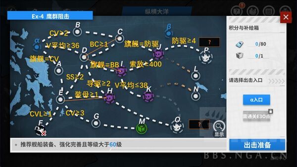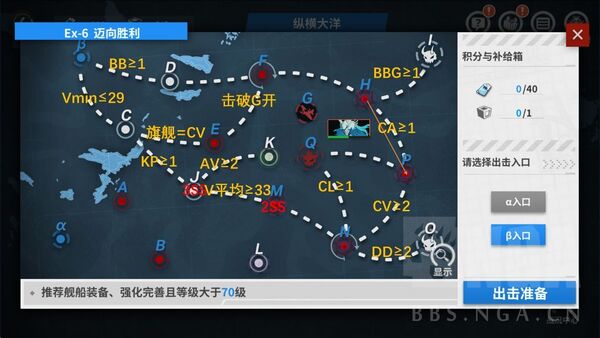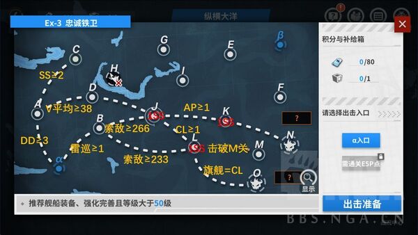 任务目标:在舰队满足只携带导驱的条件下,击败位于EX-10 O点的敌人并取得S胜及以上的评价。